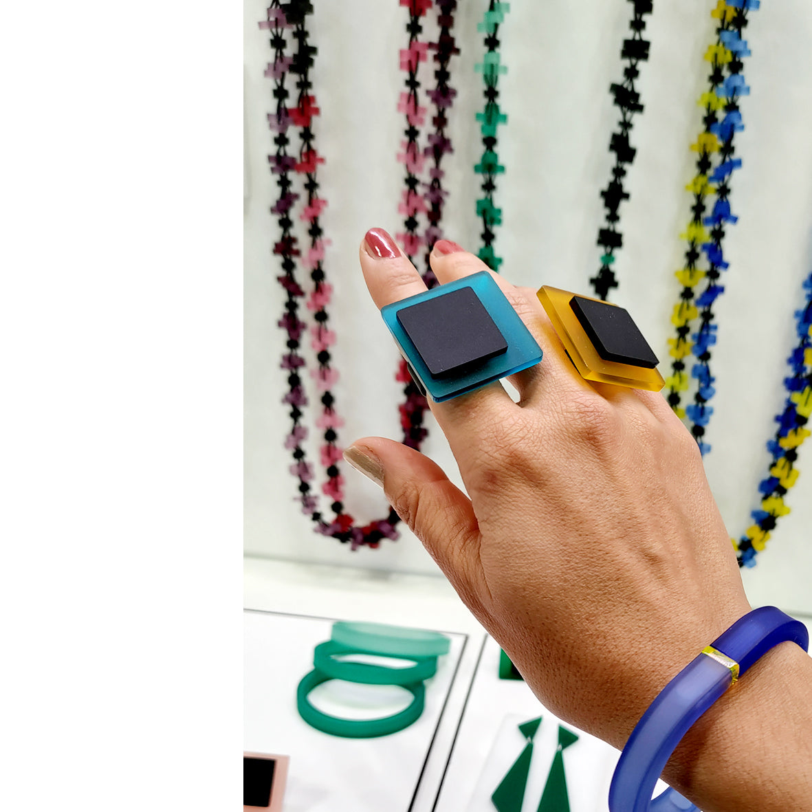 All Acrylic elements are hand-polished with a special attention to every single detail. Each piece of jewelry is carefully handcrafted in our studio in Paris, France.