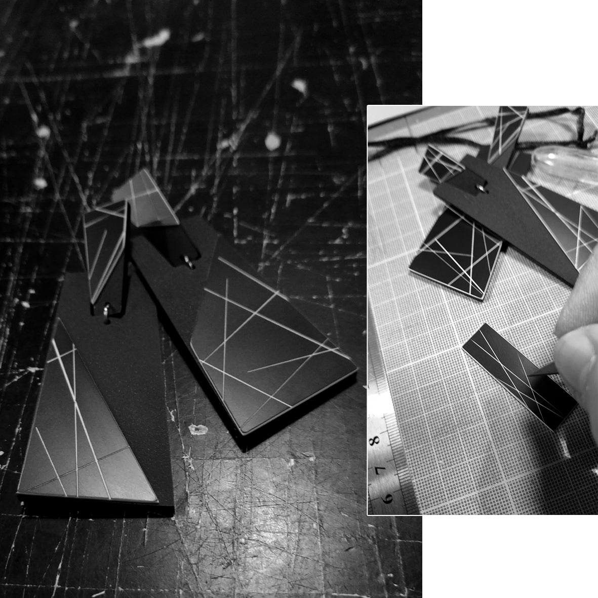 ANGELA graphic statement post & drop earrings.