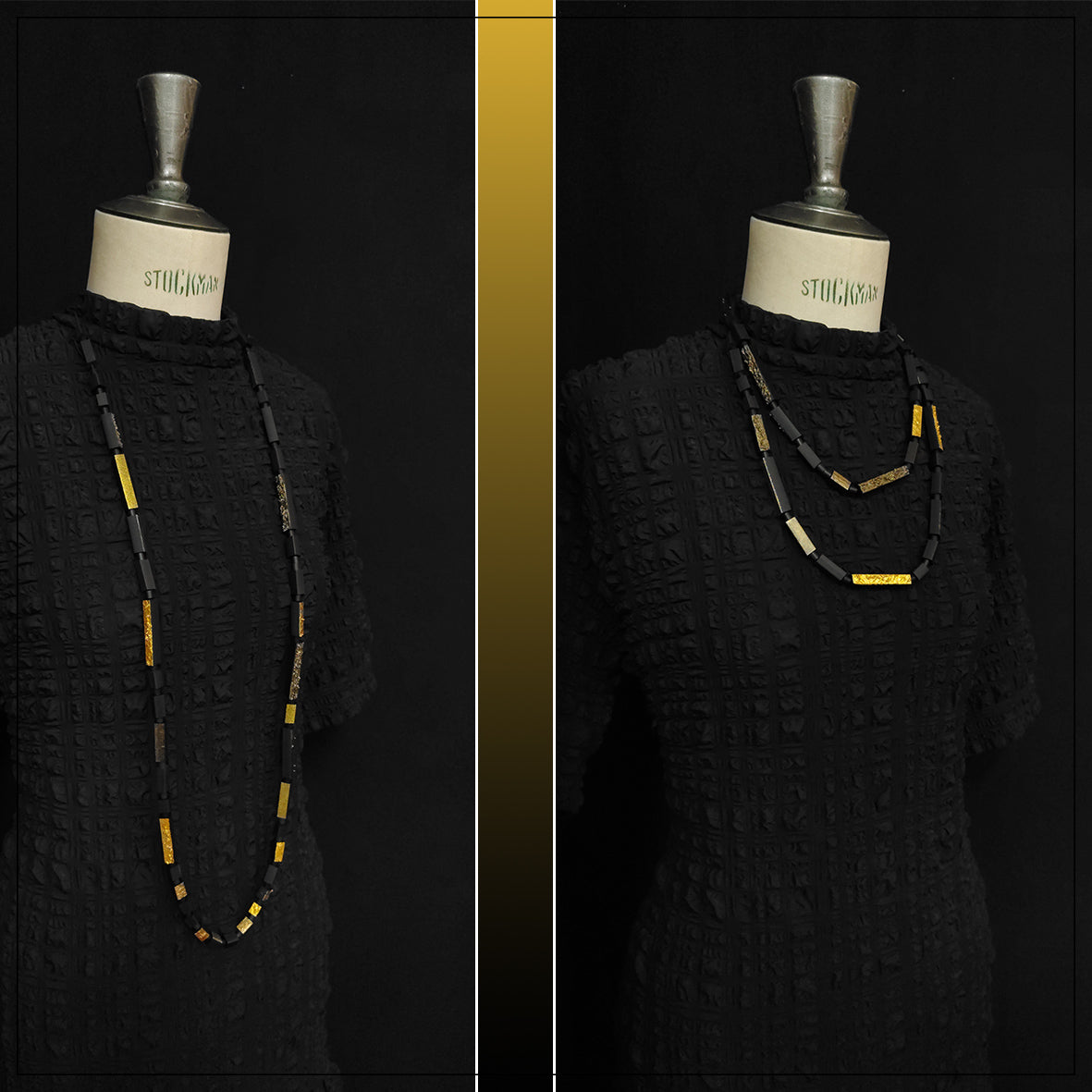 This versatile necklace, made from hand-textured rubber, feature tactile fringes that sway with every step, creating a sense of joyful motion. Whether worn over a cozy sweater or evening dress, these necklaces bring a touch of liveliness to your ensemble, transforming your outfits into a celebration of movement. Our new collection inspired by the universe of Gustave Klimt and the time of the Pharaohs. We have introduced hand textured and hand painted pieces with "trompe-l'oeil" effects. Our creative process is based on the interaction between the different materials, shapes and textures. Each piece is unique.