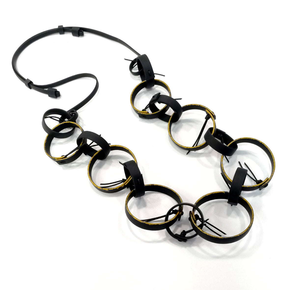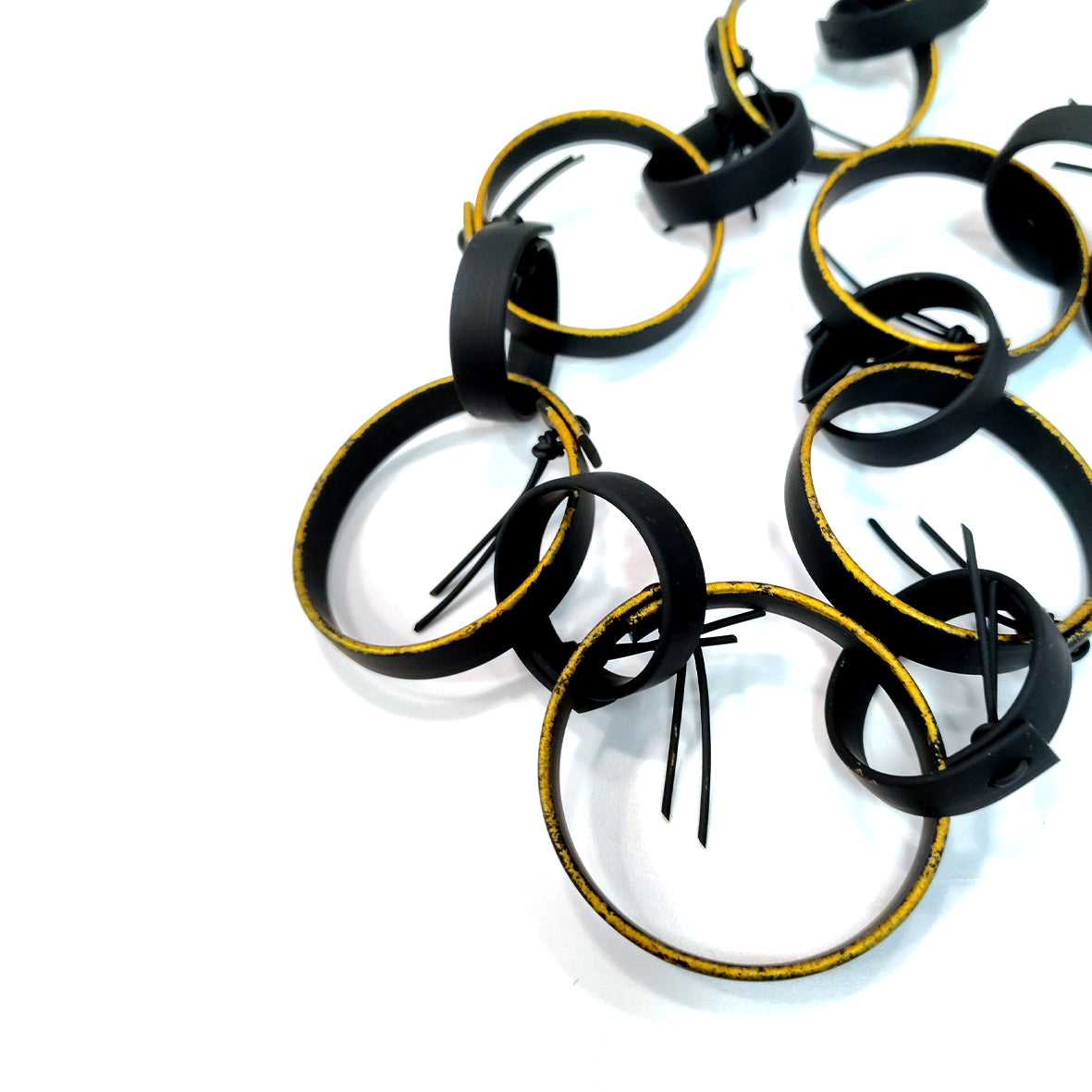 This versatile necklace, made from hand-textured rubber, feature tactile fringes that sway with every step, creating a sense of joyful motion. Whether worn over a cozy sweater or evening dress, these necklaces bring a touch of liveliness to your ensemble, transforming your outfits into a celebration of movement. Our new collection inspired by the universe of Gustave Klimt and the time of the Pharaohs. We have introduced hand textured and hand painted pieces with "trompe-l'oeil" effects. Our creative process is based on the interaction between the different materials, shapes and textures. Each piece is unique.