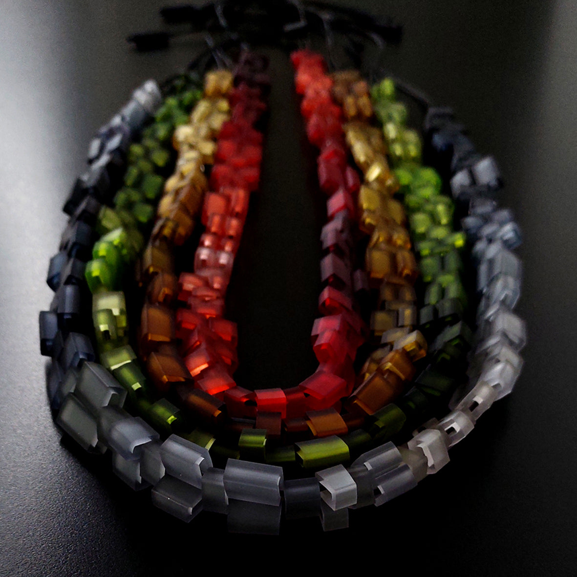 All Acrylic elements are hand-finished to be smooth and shiny. The soft-touch matt finish rubber is artfully hand-tinted and hand-transformed with love and care. Each piece of jewelry is handcrafted in our studio in Paris, France.<